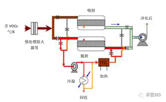 采用活性炭作為吸附劑,采用惰性氣體循環(huán)加熱脫附分流冷凝回收的工藝對有機氣體進行凈化和回收?;厥找和ㄟ^后續(xù)的精制工藝可實現(xiàn)有機物的循環(huán)利用。工藝原理示意圖如下: