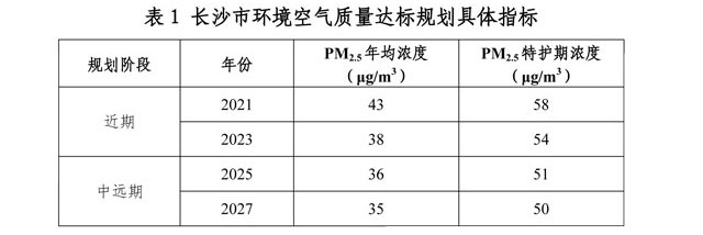 規(guī)劃目標(biāo):長沙市PM2.5年均濃度在2027年達(dá)標(biāo)。近期規(guī)劃到2023年,PM2.5平均濃度有效降低,力爭臭氧年均濃度升高趨勢基本得到遏制,中遠(yuǎn)期規(guī)劃到2027年,實現(xiàn)PM2.5年均濃度達(dá)標(biāo),臭氧超標(biāo)風(fēng)險顯著降低。具體分階段指標(biāo)如下: