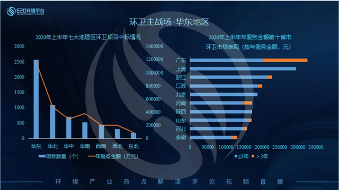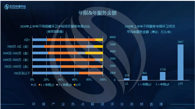 也正如前面所講的,對比分析了E20關注的環(huán)衛(wèi)十大影響力入圍企業(yè)2020年上半年市場表現(xiàn),發(fā)現(xiàn)他們10年以上長服務期項目業(yè)績表現(xiàn)突出,尤其十大影響力企業(yè)拿到了超一半的10年以上項目。年服務金額在5000萬元/年以上的項目中,環(huán)衛(wèi)十大影響力企業(yè)也拿到了約33%的份額。讓我們期待下半年這些公司再創(chuàng)佳績。