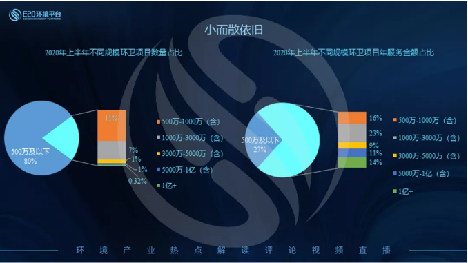 再來看,環(huán)衛(wèi)市場小而散的局面依舊沒有改變E20研究院數(shù)據(jù)中心統(tǒng)計,目前大概有12000-13000余家企業(yè)參與到環(huán)衛(wèi)市場化的競爭中,總體來看基本符合“二八定律”,也就是,2020年上半年年服務金額在500萬及以下的環(huán)衛(wèi)項目數(shù)量占整體的80%,而這80%的環(huán)衛(wèi)項目卻只占據(jù)環(huán)衛(wèi)市場份額的20%。這和去年環(huán)衛(wèi)論壇上薛濤院長分享的環(huán)衛(wèi)整體趨勢一致。