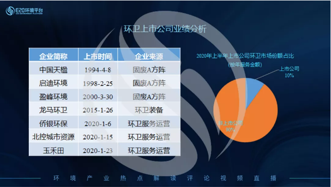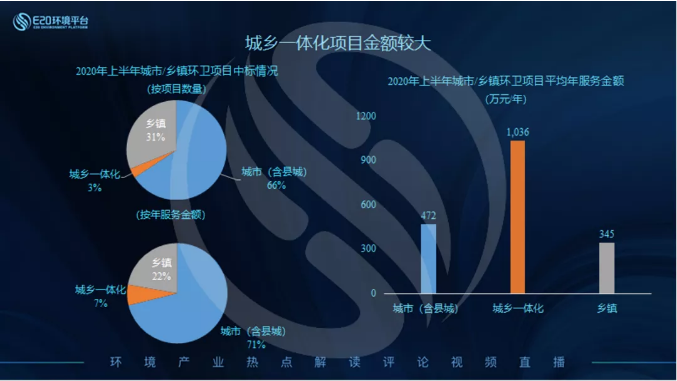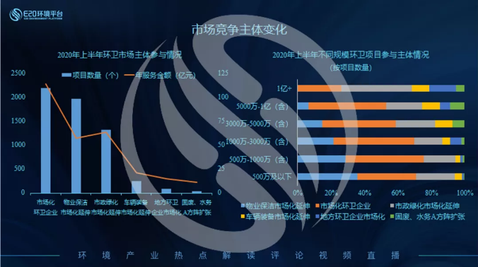 和2019年同期相比,2020年上半年環(huán)衛(wèi)市場釋放項目數(shù)量有所增加,新增年服務金額總額較2019年同期增長11.2%。我們知道,2019年9月我們曾經(jīng)盤點過一次,對比2018年業(yè)績同比是平滑不增的一年,那么,疫情影響下的環(huán)衛(wèi)市場化總規(guī)模上半年的同比增長,讓我們對2020年底的E20第十四屆固廢戰(zhàn)略論壇公布的環(huán)衛(wèi)十大影響力企業(yè)大榜和年終盤點充滿期待。
