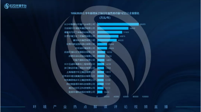 7、2017年是環(huán)衛(wèi)市場化元年,那2019年則是環(huán)衛(wèi)資本化元年,2020年半年已過,E20研究院數(shù)據(jù)中心對環(huán)衛(wèi)企業(yè)2020年上半年業(yè)績進行了盤點和大排名,其中18家環(huán)衛(wèi)企業(yè)2020年上半年新增環(huán)衛(wèi)項目年服務費超過1億。另外,排名中可以看到環(huán)衛(wèi)上市公司7家均在“億元戶”光榮榜上大榜有名,盈峰中聯(lián)、北控城市服務上半年新增業(yè)績最為突出,半年新增年服務費總額分別為8億和6億。