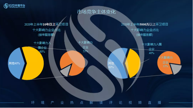 8、對比分析了E20關注的環(huán)衛(wèi)十大影響力入圍企業(yè)2020年上半年市場表現(xiàn),發(fā)現(xiàn)他們10年以上長服務期項目業(yè)績表現(xiàn)突出,尤其十大影響力企業(yè)拿到了超一半的10年以上項目。年服務金額在5000萬元/年以上的項目中,環(huán)衛(wèi)十大影響力企業(yè)也拿到了約33%的份額。讓我們期待下半年這些公司再創(chuàng)佳績,2020年年底,我們將在北京迎來2020年度中國環(huán)衛(wèi)十大影響力企業(yè)評選,歡迎大家繼續(xù)關注與參與,讓我們在2020年第十四屆固廢戰(zhàn)略論壇再聚首,熱論弄潮英雄。