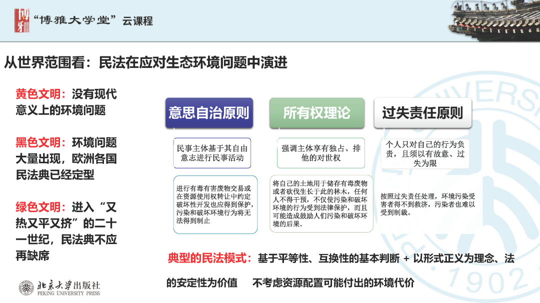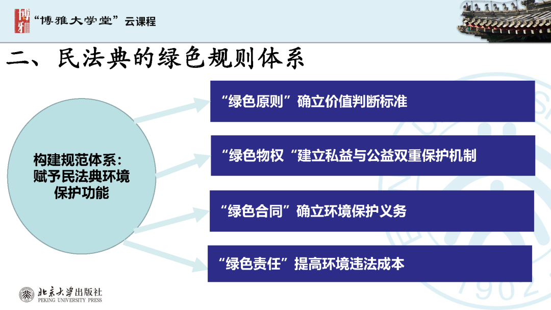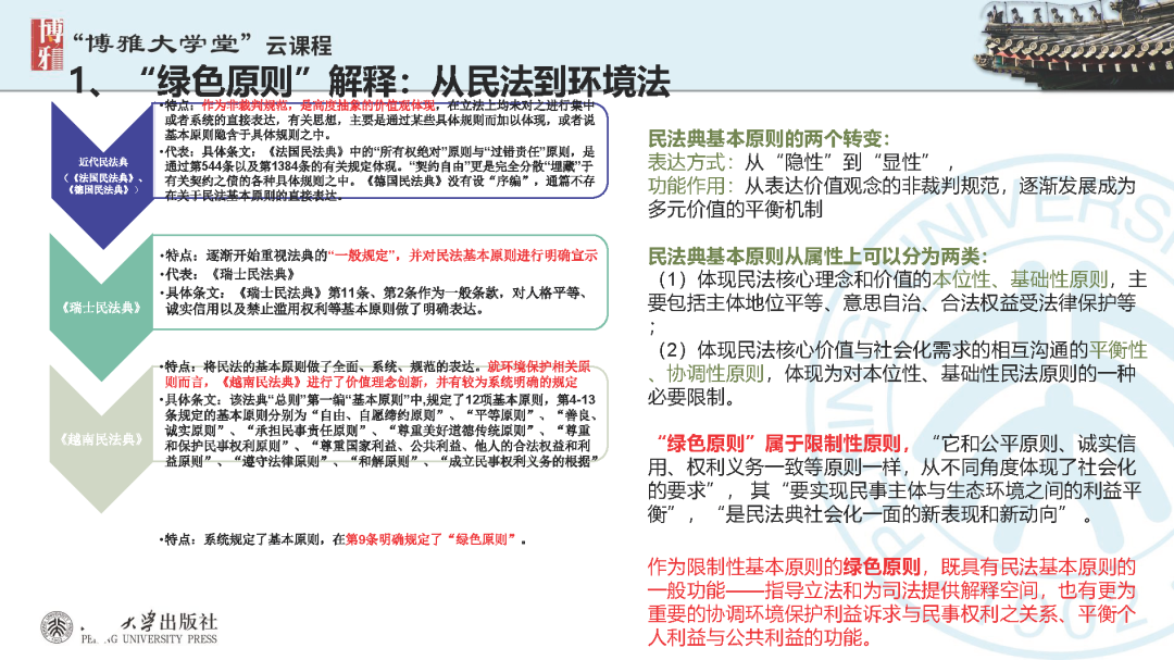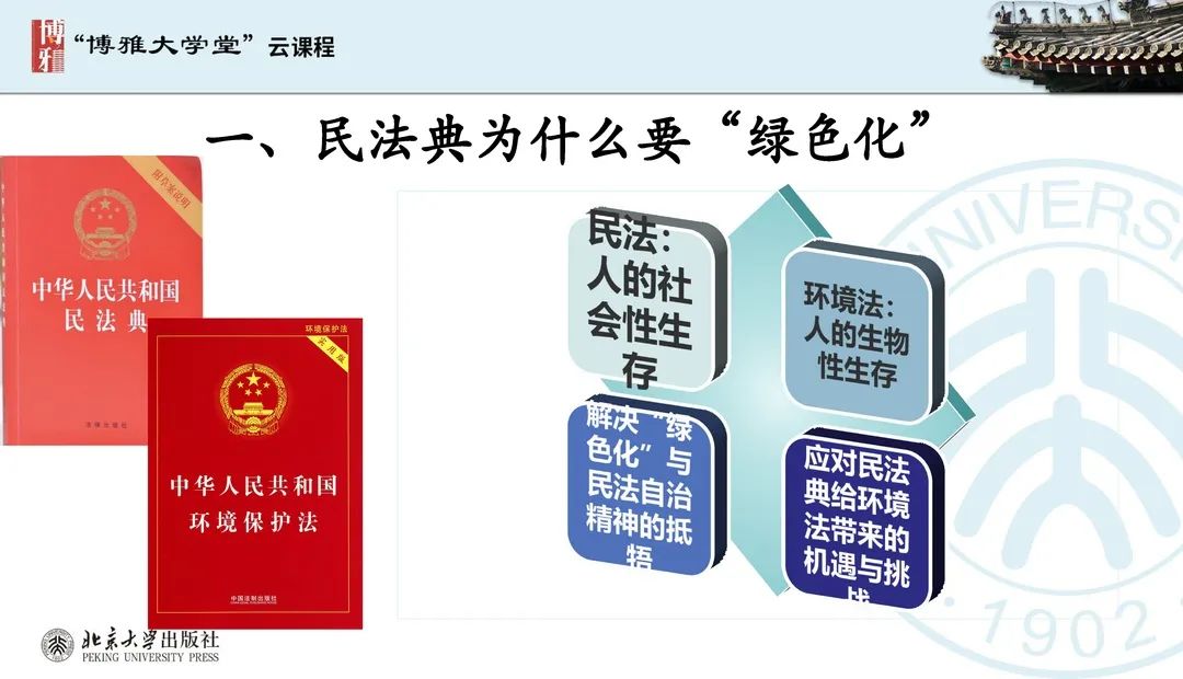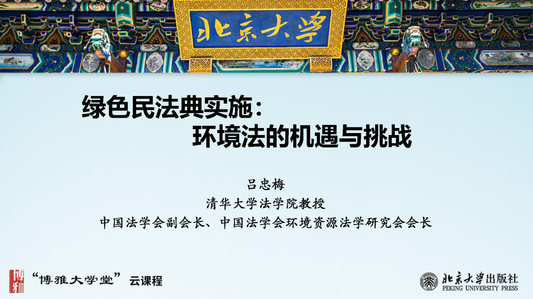 本文為?呂忠梅?老師在博雅大學(xué)堂上的報(bào)告。題目為《綠色民法典實(shí)施:環(huán)境法的機(jī)遇與挑戰(zhàn)》。內(nèi)容主要涉及民法典為什么要綠色化、民法典的綠色規(guī)則體系及綠色民法典給環(huán)境法帶來的新機(jī)遇和新挑戰(zhàn)。