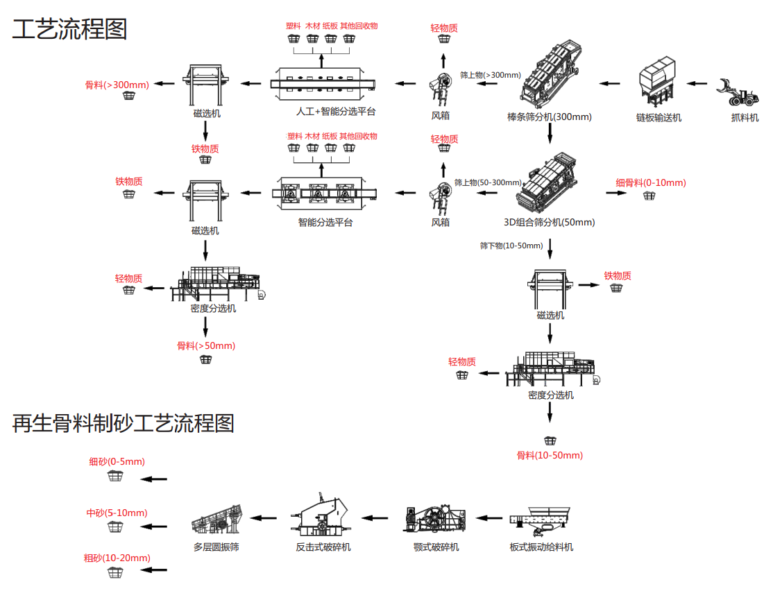 斯瑞德建筑裝修垃圾預(yù)處理方案利用不同的振動(dòng)篩、馳張篩組成篩分系統(tǒng),將裝修垃圾按照尺寸進(jìn)行篩分,從而獲得不同尺寸的粉料、骨料;通過人工分選、智能分選、磁選等分選流程,回收紙板、廢舊金屬、塑料、木材等再生資源;采用風(fēng)選篩分出可以制造RDF的輕質(zhì)物料,實(shí)現(xiàn)裝修垃圾的價(jià)值最大化。