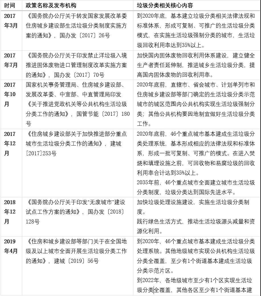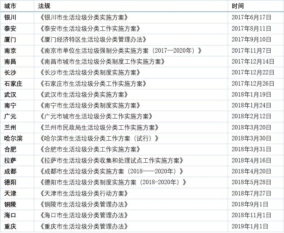 2017年底,住房城鄉(xiāng)建設(shè)部發(fā)布《關(guān)于加快推進(jìn)部分重點(diǎn)城市生活垃圾分類工作的通知》,要求2018年3月底前,46個重點(diǎn)城市要出臺生活垃圾分類管理實(shí)施方案或計劃行動,明確年度工作目標(biāo),量化工作任務(wù)。