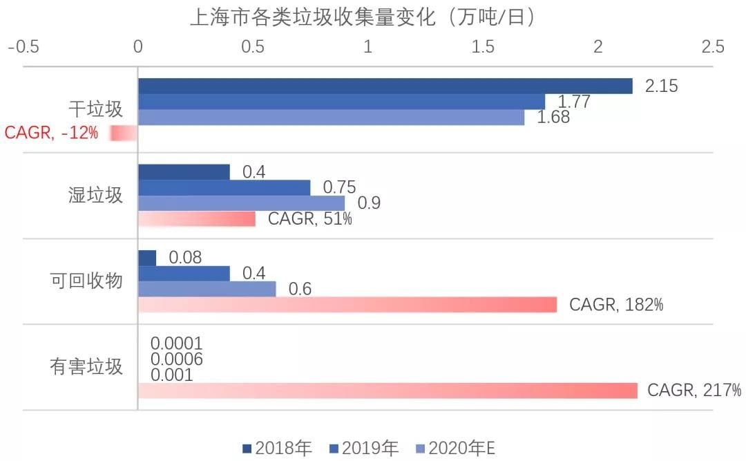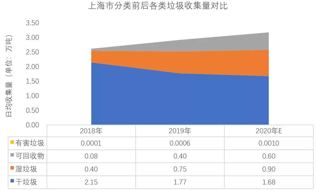 垃圾分類的效果在以上海為代表的部分城市已經(jīng)開始有所體現(xiàn),可收集垃圾結(jié)構(gòu)發(fā)生明顯改變,濕垃圾(廚余垃圾)占比明顯提升并逐步穩(wěn)定:上海市在2019年7月1日正式實(shí)施強(qiáng)制分類之后,取得了顯著的成效,2019年1.3萬余個居住區(qū)(村)垃圾分類達(dá)標(biāo)率由2018年年底的15%提高到90%,單位達(dá)標(biāo)率總體為87%。具體到各類垃圾來看,2019年,上海日均干垃圾處置量1.77萬噸,濕垃圾分出量0.75萬噸,可回收物0.40萬噸,有害垃圾分出量0.6噸,同比分別減少17.5%,增加88.8%、431.8%和504.1%。