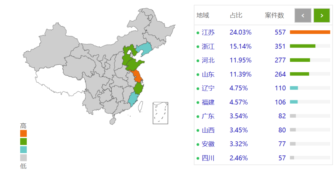 從全國來看,江蘇、浙江、河北、山東、遼寧五個省份的案件數(shù)量先后位列前五名,對此,該地區(qū)的相關(guān)從業(yè)者必須提起應(yīng)有的重視!
