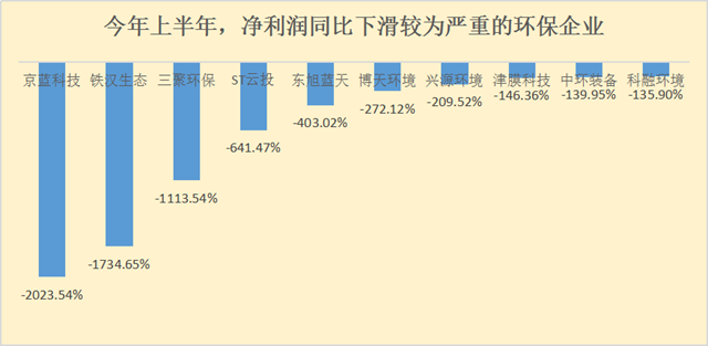 虧損幅度較為嚴(yán)重的當(dāng)屬京藍(lán)科技、鐵漢生態(tài)和三聚環(huán)保,凈利潤分別較去年同期下降了-2023.54%、-1734.65%和-1113.54%,經(jīng)營狀況惡化。
