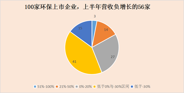 營收變動幅度方面,數(shù)據(jù)不那么喜人。100家環(huán)保上市企業(yè),上半年?duì)I收同比下滑,負(fù)增長有56家,接近6成。也就是說,一半以上的企業(yè)主營業(yè)務(wù)收入都不及往年。(如圖四)