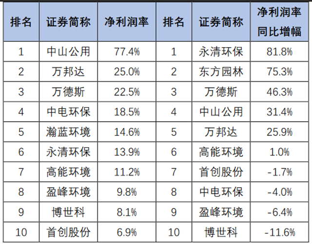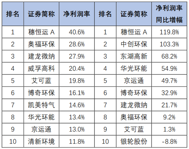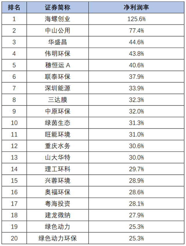 2020年上半年163家(A股+港股)環(huán)保上市公司凈利潤(rùn)率TOP20