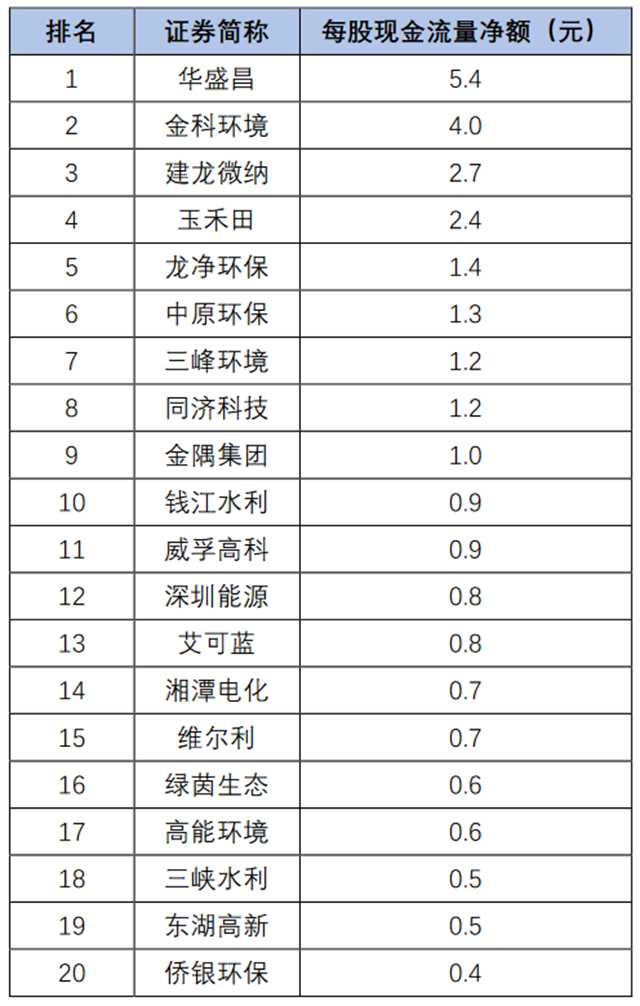 2020年上半年A股環(huán)保上市公司每股現(xiàn)金流量?jī)纛~TOP20