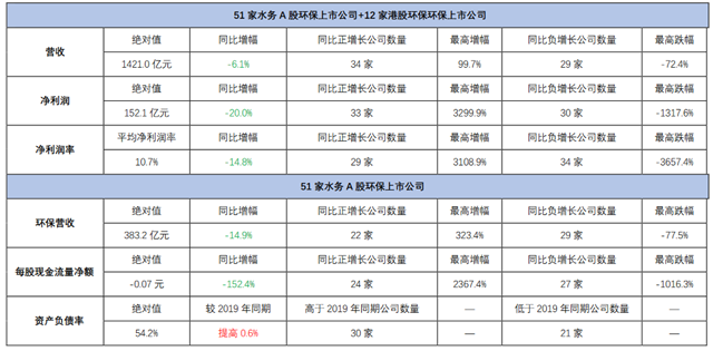 總體來(lái)看,2020年上半年水務(wù)A股及港股環(huán)保上市公司營(yíng)收總額同比下降,A股環(huán)保上市公司環(huán)保營(yíng)收總額同比下滑;整體獲利能力不及上年同期,凈利潤(rùn)總額和凈利潤(rùn)率均同比下滑;現(xiàn)金流情況不及上年同期,負(fù)債水平較上年同期小幅上升。