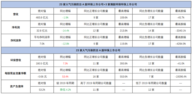 總體來(lái)看,2020年上半年大氣污染防治A股及港股環(huán)保上市公司營(yíng)收總額同比小幅下降,A股環(huán)保上市公司環(huán)保營(yíng)收總額同比增長(zhǎng);整體獲利能力不及上年同期,凈利潤(rùn)總額和凈利潤(rùn)率均同比下滑;現(xiàn)金流情況有所改善,負(fù)債水平下降。