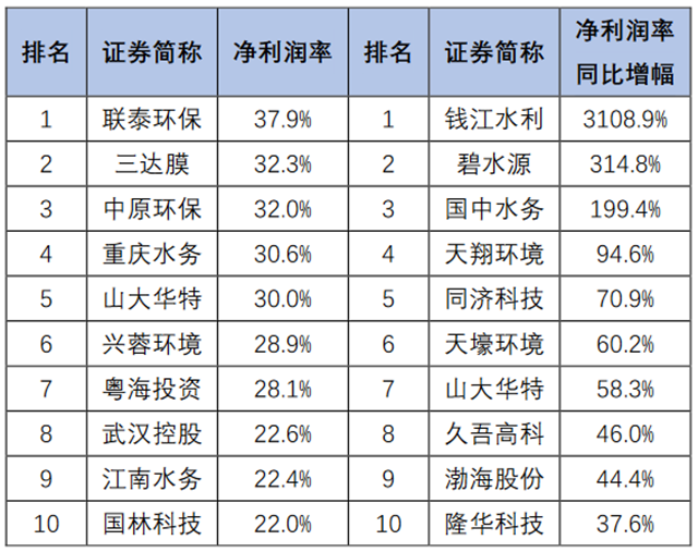 2020年上半年水務(wù)(A股+港股)環(huán)保上市公司凈利潤(rùn)率及其同比增幅TOP10