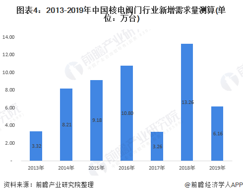 前瞻依照上述邏輯測(cè)算,2013年中國(guó)核電閥門(mén)需求量為3.32萬(wàn)臺(tái),其中2018年為近年最高,達(dá)到13.26萬(wàn)臺(tái)。通過(guò)數(shù)據(jù)發(fā)現(xiàn),核電閥門(mén)需求量與中國(guó)核電投資額的變化基本一致,這也說(shuō)明核電閥門(mén)新增需求行業(yè)發(fā)展嚴(yán)重依賴(lài)上游核電公司。