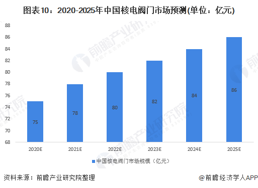 根據(jù)中國(guó)政府發(fā)布的十三五計(jì)劃和《中國(guó)能源中長(zhǎng)期(2030-2050)發(fā)展戰(zhàn)略研究》,中國(guó)政府規(guī)劃以每年6-8座的速度新建核電站,并為引進(jìn)自主開(kāi)發(fā)的新型核電站將投入共5000億元資金。依照過(guò)去十幾年中國(guó)核電建設(shè)速度來(lái)看,6-8座核電站(12-16個(gè)機(jī)組)顯然是不太現(xiàn)實(shí),前瞻假設(shè)以每年新建3座核電站計(jì)算,每座核電站裝配兩個(gè)機(jī)組(共6個(gè)機(jī)組),且每年3座核電站(6個(gè)機(jī)組)都在當(dāng)年年底之前投入運(yùn)營(yíng)。通過(guò)對(duì)新增裝機(jī)部分需求和已運(yùn)營(yíng)電機(jī)部分進(jìn)行計(jì)算,前瞻預(yù)測(cè)2025年中國(guó)核電閥門(mén)市場(chǎng)將會(huì)達(dá)到86億元。