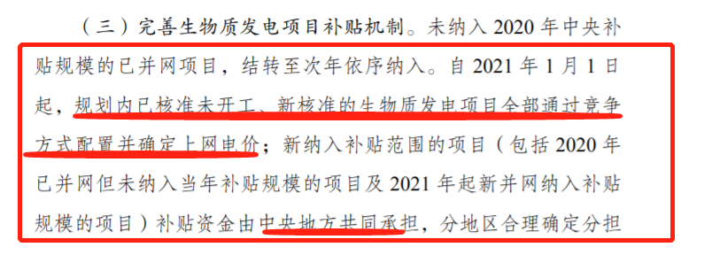 一是競(jìng)爭(zhēng)性配置項(xiàng)目資源。自2021年1月1日起,規(guī)劃內(nèi)已核準(zhǔn)未開工和新核準(zhǔn)的生物質(zhì)發(fā)電項(xiàng)目全部通過競(jìng)爭(zhēng)方式確定上網(wǎng)電價(jià)。