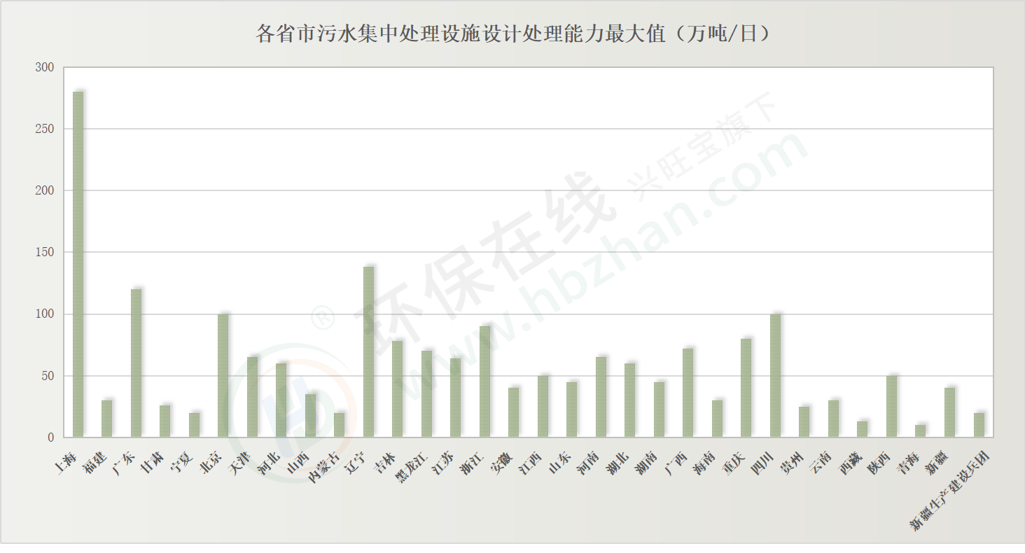 被納入清單的各省市污水集中處理設施設計處理能力最大值: