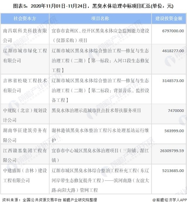 全國公共資源交易平臺數(shù)據(jù)顯示,2020年11月01日-11月24日,共15起社會資本中標(biāo)黑臭水體治理項目,投資額總計8939.69萬元,其中,包含6個黑臭水體整治項目。
