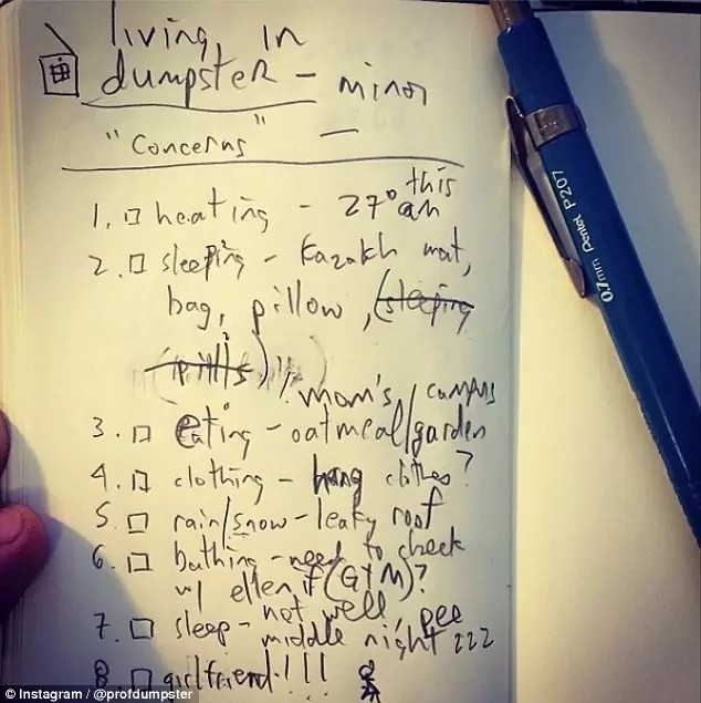 他飛跑去向教務(wù)長(zhǎng)申請(qǐng): “我想把校園草坪上的垃圾箱變成一個(gè)微小的可持續(xù)的家,并到里面去住?!?教務(wù)長(zhǎng)雖然不是很懂這個(gè)教授的腦回路,但是想想垃圾箱也不貴,就同意了。