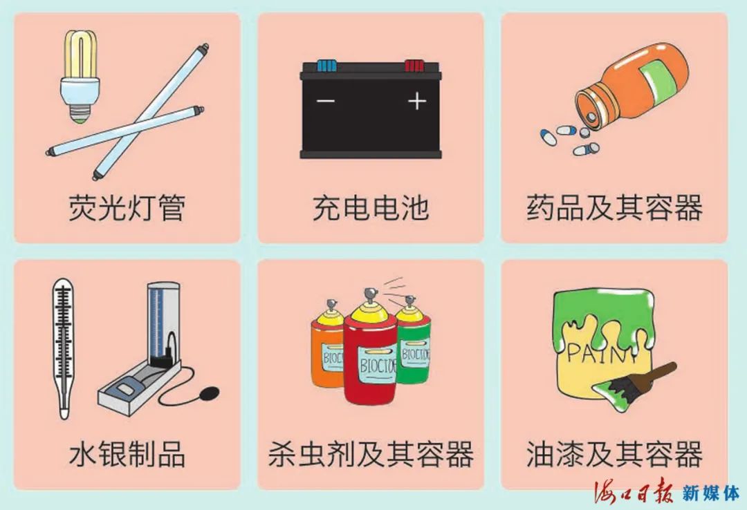 主要包括:廢電池(鎘鎳電池、氧化汞電池、鉛蓄電池等),廢熒光燈管(日光燈管、節(jié)能燈等),廢溫度計,廢血壓計,廢藥品及其包裝物,廢油漆、溶劑及其包裝物,廢殺蟲劑、消毒劑及其包裝物,廢膠片及廢相紙等。