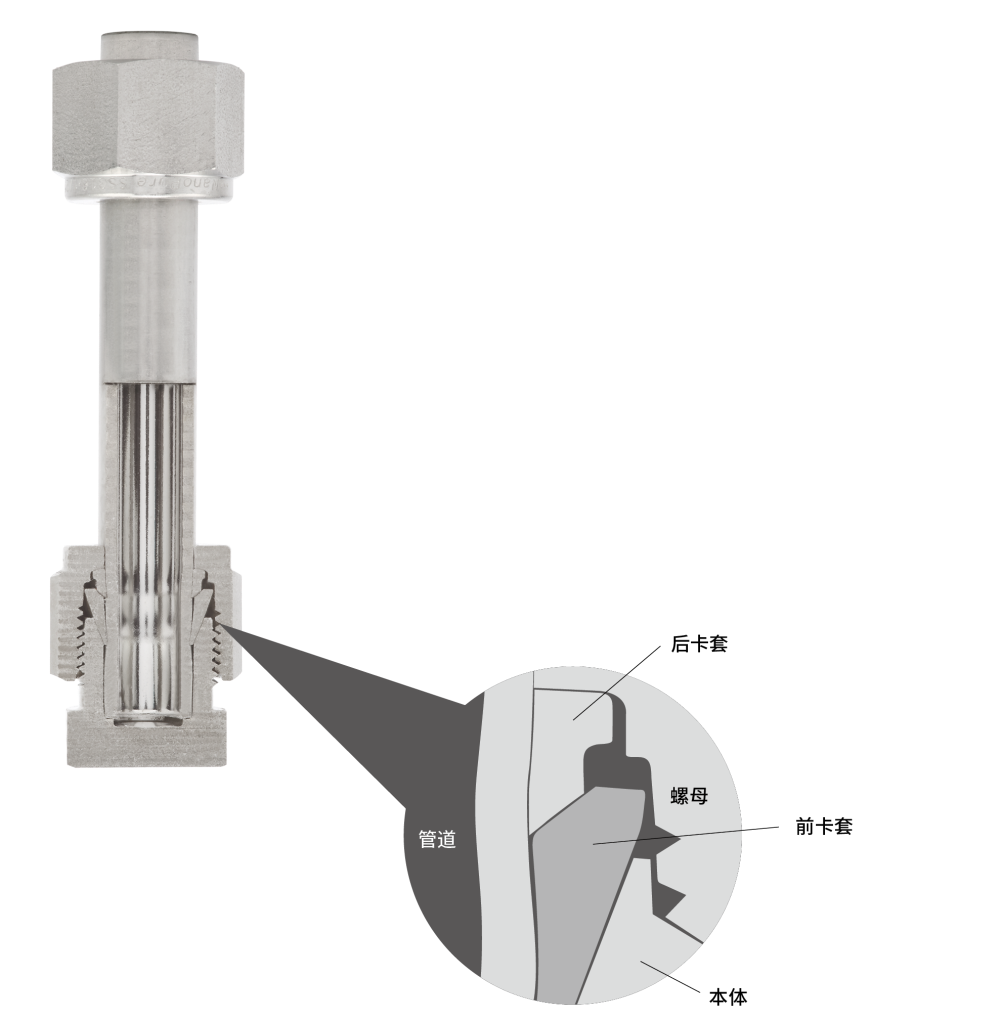 在如上的裝配過程中,前卡套被打入裝配體和管道中,以形成主密封,而后卡套向內(nèi)鉸鏈,以形成對管道的有力抓握。后卡套的幾何結(jié)構(gòu)允許改進的工程鉸鏈夾頭作用,將軸向運動轉(zhuǎn)化為管子上的徑向擠鍛作用,但在裝配扭矩要求較低的情況下工作。