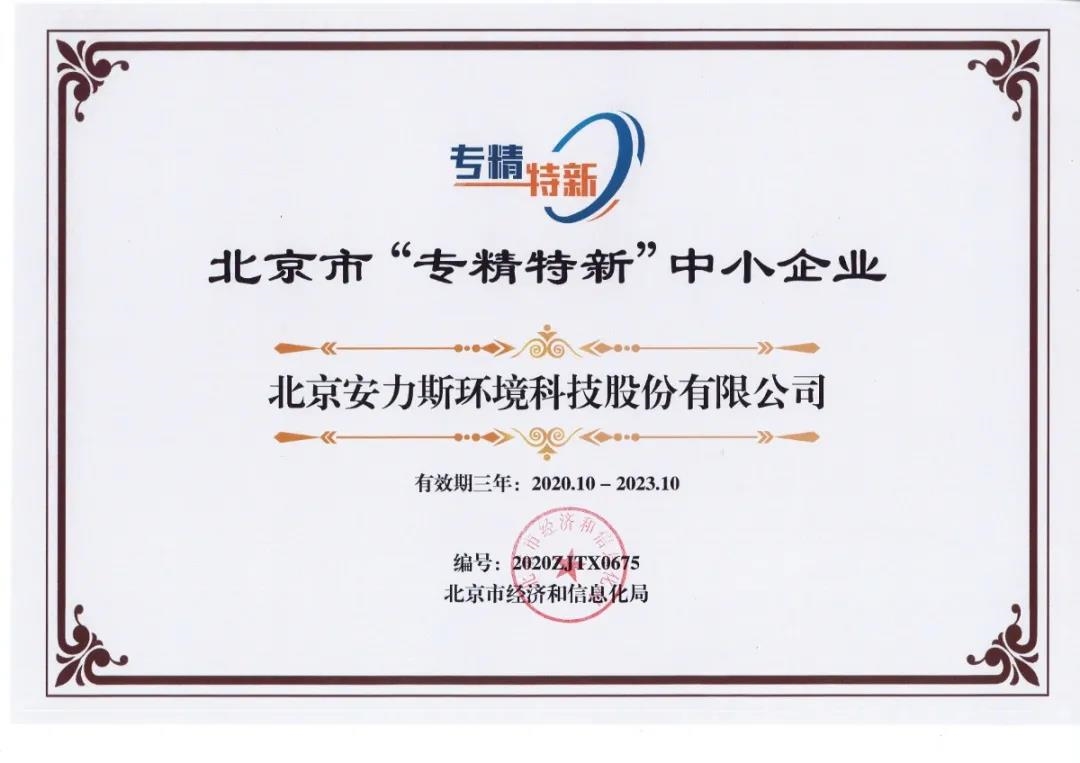 2020年7月,北京市經濟和信息化委員會公示《2020年度北京市“專精特新”中小企業(yè)》第二批名單,北京安力斯環(huán)境科技股份有限公司(以下簡稱“安力斯環(huán)境”)成功入選,被授予2020年度北京市“專精特新”中小企業(yè)稱號。