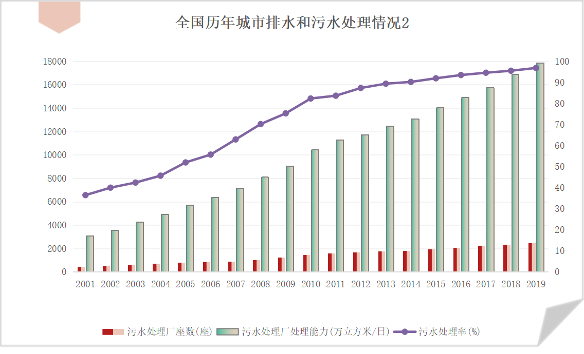 上圖也可以看出,我國城市污水處理能力隨著污水處理廠的增多顯著上升,污水處理率也是節(jié)節(jié)攀升。