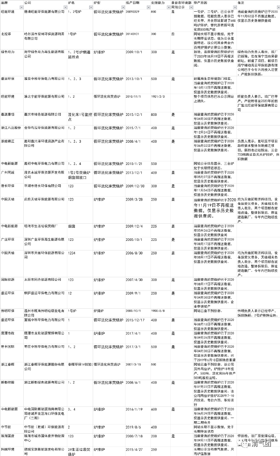 旗下的另一間企業(yè),淮北宇能環(huán)保能源有限公司(800噸處理量,兩臺(tái)循環(huán)流化床)已經(jīng)整體停運(yùn),相關(guān)垃圾處理業(yè)務(wù)也轉(zhuǎn)由該公司在此地遷址重建的新廠——淮北旺能環(huán)保能源有限公司,并已于2020年正式投運(yùn),新廠處理量1500噸,兩臺(tái)750噸爐排爐。錦江環(huán)境:旗下昆明鑫興澤環(huán)境資源產(chǎn)業(yè)有限公司,共有三臺(tái)爐,處理量為1200噸,已于2020年06月02日不再報(bào)送數(shù)據(jù),并已在生態(tài)環(huán)境部生活垃圾焚燒發(fā)電廠自動(dòng)監(jiān)測信息公示平臺(tái),進(jìn)行了主動(dòng)公示。據(jù)悉,該項(xiàng)目屬于應(yīng)政府要求整體異地搬遷、拆舊換新的項(xiàng)目,且新廠已經(jīng)投運(yùn),新項(xiàng)目的焚燒爐為三臺(tái)750噸爐排爐。不過,研究團(tuán)隊(duì)尚未在公示平臺(tái)查詢到相關(guān)信息,估計(jì)還是處于試運(yùn)行狀態(tài),相關(guān)煙氣、爐溫、工況等數(shù)據(jù)尚未上網(wǎng)。中國天楹:旗下啟東和深圳項(xiàng)目,目前均整體停運(yùn),并已在生態(tài)環(huán)境部生活垃圾焚燒發(fā)電廠自動(dòng)監(jiān)測信息公示平臺(tái),進(jìn)行了主動(dòng)公示。據(jù)悉,兩個(gè)項(xiàng)目都是并購項(xiàng)目,前期設(shè)備和環(huán)保設(shè)施欠債較多,需要進(jìn)行就地改造,整體拆除原有設(shè)備,原址新建焚燒爐臺(tái)套產(chǎn)線,基本算是原址建造新廠,且今年內(nèi)都將陸續(xù)投產(chǎn)。不過,研究團(tuán)隊(duì)尚未在公示平臺(tái)查詢到相關(guān)信息,估計(jì)還是處于試運(yùn)行狀態(tài),相關(guān)煙氣、爐溫、工況等數(shù)據(jù)尚未上網(wǎng)。偉明環(huán)保:旗下溫州甌海項(xiàng)目,停運(yùn)了一臺(tái)160噸的爐排爐,該爐于2000年投產(chǎn),至今已運(yùn)行20年。綠色動(dòng)力:旗下海寧綠色動(dòng)力再生能源有限公司(處理量六百噸,兩臺(tái)09年投運(yùn)爐排爐)已經(jīng)停運(yùn)。同時(shí),在海寧當(dāng)?shù)亓肀傩轮?,新建了?xiàng)目海寧綠動(dòng)海云環(huán)保能源有限公司,已于今年六月投入運(yùn)營,新項(xiàng)目處理量為1500噸,兩臺(tái)750噸爐排爐。相關(guān)信息已在生態(tài)環(huán)境部生活垃圾焚燒發(fā)電廠自動(dòng)監(jiān)測信息公示平臺(tái),進(jìn)行了主動(dòng)公示。