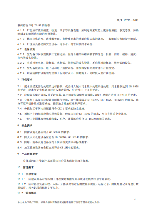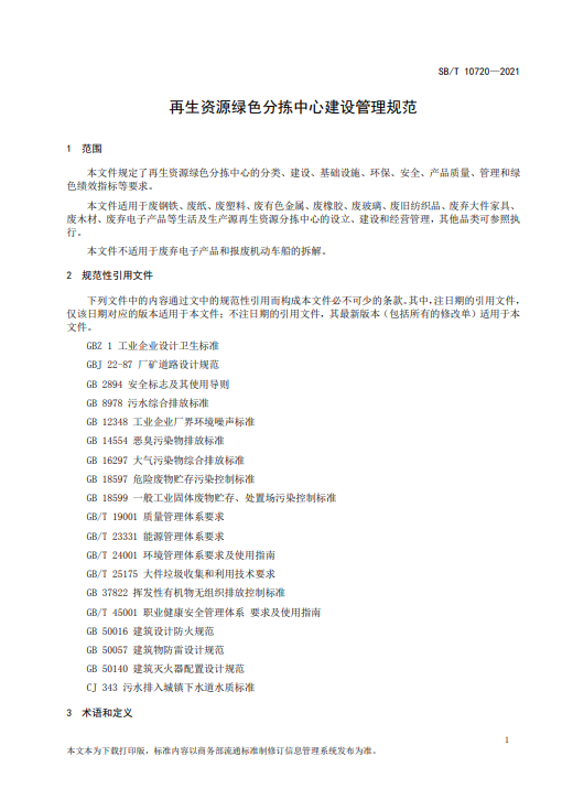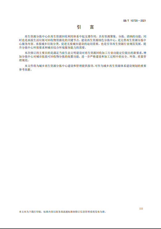 新修訂的《再生資源分揀中心建設(shè)管理規(guī)范》經(jīng)商務(wù)部公告,將于2021年5月1日實(shí)施。修訂后的標(biāo)準(zhǔn)適用范圍更為明確,增加了引言、廢棄大件家具的術(shù)語、分揀中心的分類、基本要求、部分環(huán)保要求、部分安全要求、產(chǎn)品質(zhì)量要求、管理要求和績效指標(biāo)等內(nèi)容。