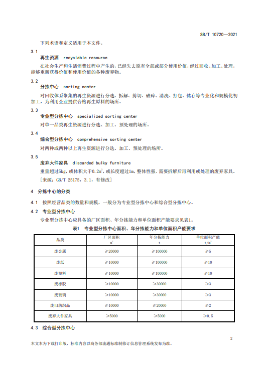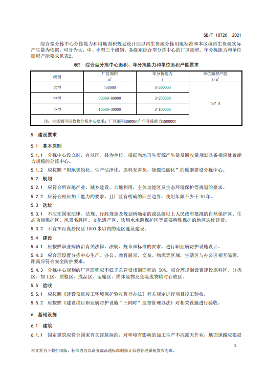 修訂后的標(biāo)準(zhǔn)更加關(guān)注規(guī)劃設(shè)計(jì)的科學(xué)性和適用性。新標(biāo)準(zhǔn)在規(guī)劃設(shè)計(jì)中提出了宜以區(qū)、縣為單位,根據(jù)當(dāng)?shù)卦偕Y源產(chǎn)生量及回收量規(guī)劃具備相應(yīng)處置能力規(guī)模的分揀中心,這一要求與當(dāng)前以區(qū)縣為單位建立健全生活垃圾分類處理設(shè)施的相關(guān)工作要求相一致。 修訂后的標(biāo)準(zhǔn)核心和亮點(diǎn)之一是對專業(yè)型和綜合型分揀中心分別提出了廠區(qū)面積、分揀加工能力和單位面積產(chǎn)能的量化指標(biāo)。這一系列指標(biāo)是在全面調(diào)研和科學(xué)計(jì)算基礎(chǔ)上,平衡了南北差異和城市類別,提出了適用性和科學(xué)性指標(biāo)。尤其是單位面積產(chǎn)能指標(biāo)的提出,為行業(yè)內(nèi)首次,對各級政府開展分揀中心的規(guī)劃和設(shè)計(jì)工作具有重要指導(dǎo)意義。附件:《再生資源綠色分 揀中心建設(shè)管理規(guī)范》(SB/T10720-2021)