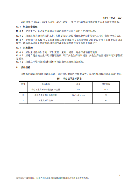 修訂后的標(biāo)準(zhǔn)更加關(guān)注分揀中心的環(huán)保要求,對分揀中心的廢水處理、降噪、廢氣排放、防塵、危險(xiǎn)廢物和一般工業(yè)固廢的管理進(jìn)行了分別規(guī)范。尤其是績效指標(biāo)的提出,以可量化的手段對再生資源綠色分揀中心的分揀加工能力和節(jié)能降耗水平給與評價(jià)。同時(shí)也更加注重質(zhì)量管理、安全管理和職業(yè)健康管理,新增了職工安全生產(chǎn)培訓(xùn)制度、職業(yè)病防治制度、安全生產(chǎn)檢查制度和突發(fā)事件應(yīng)急預(yù)案管理等要求。