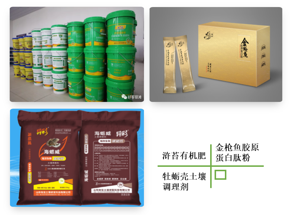 針對滸苔污染,支持溫喜生物科技有限公司,通過研發(fā)生物發(fā)酵技術(shù),構(gòu)建滸苔綜合利用產(chǎn)業(yè)鏈,生產(chǎn)有機肥、土壤調(diào)理劑,可年處理鮮滸苔10余萬噸,實現(xiàn)產(chǎn)值3500余萬元。針對廢棄牡蠣殼,依托山東地寶土壤修復科技有限公司,利用高溫增氧活化等技術(shù),可日生產(chǎn)300噸功能性土壤調(diào)理劑,年銷售產(chǎn)品5萬余噸。針對金槍魚加工后剩余的魚骨、魚皮等,推動藍潤集團研發(fā)酶組合技術(shù),開發(fā)生產(chǎn)金槍魚膠原蛋白肽粉、口服液、面膜等系列產(chǎn)品,附加值翻了數(shù)十倍,真正實現(xiàn)將一條金槍魚“吃干榨凈”。圖 14 威海市“海洋廢棄物”資源化利用產(chǎn)品2. 制度模式創(chuàng)新