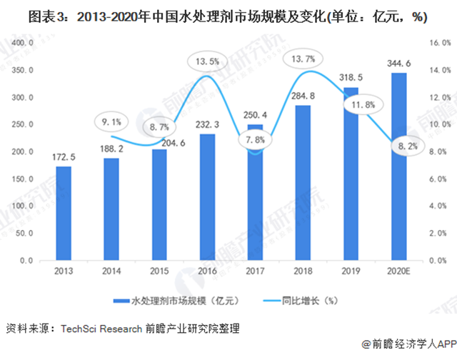 我國的水處理藥劑市場處于快速增長的階段,根據(jù)TechSci Research數(shù)據(jù)顯示,2019年我國水處理劑市場規(guī)模達318.5億元,預(yù)計2020年我國市場規(guī)模增長率約為8.2%,達到344.6億元。