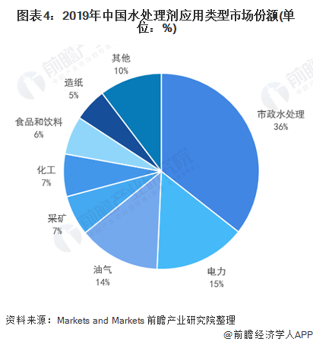 根據(jù)Markets and Markets的數(shù)據(jù),2019年我國市政水處理、電力、油氣、采礦、化工、食品和飲料、造紙、其他領(lǐng)域水處理藥劑市場占比中,用于市政水處理的水處理劑市場規(guī)模最大,約為36%,為水處理劑最大的應(yīng)用市場;其次是電力領(lǐng)域和油氣領(lǐng)域,分別占比15%和14%。