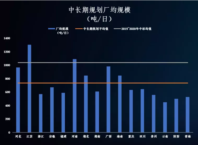 E20研究院通過對各省中長期規(guī)劃的分析發(fā)現(xiàn),中長期規(guī)劃中新增生活垃圾焚燒項(xiàng)目的廠均規(guī)模已將從2019~2020年的平均值1037噸/日下降至736噸/日,降幅達(dá)到30%。