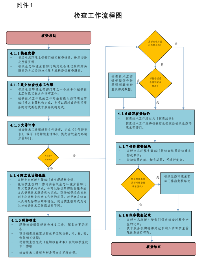 核查程序包括核查安排、建立核查技術(shù)工作組、文件評審、建立現(xiàn)場核查組、實(shí)施現(xiàn)場核查、出具《核查結(jié)論》、告知核查結(jié)果、存核查記錄等八個步驟,核查工作流程圖見附件1。