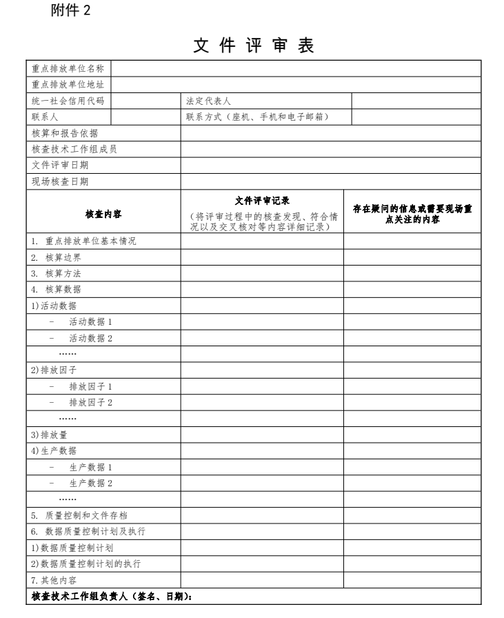技術(shù)工作組應(yīng)根據(jù)相應(yīng)行業(yè)的溫室氣體排放核算方法與報告指南(以下簡稱核算指南)、相關(guān)技術(shù)規(guī)范,對重點(diǎn)排放單位提交的排放報告及數(shù)據(jù)質(zhì)量控制計(jì)劃等支撐材料進(jìn)行文件評審,初步確認(rèn)重點(diǎn)排放單位的溫室氣體排放量和相關(guān)信息的符合情況,識別現(xiàn)場核查重點(diǎn),提出現(xiàn)場核查時間、需訪問的人員、需觀察的設(shè)施、設(shè)備或操作以及需查閱的支撐文件等現(xiàn)場核查要求,并按附件2和附件3的格式分別填寫完成《文件評審表》和《現(xiàn)場核查清單》提交省級生態(tài)環(huán)境主管部門。