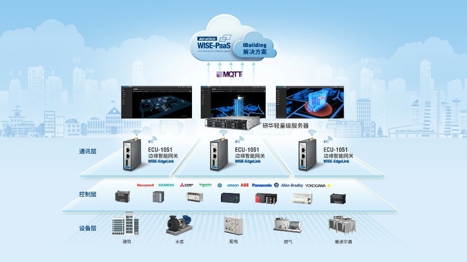 隨著能源的日益匱乏及國家碳中和碳達標的相關政策引導,各地政府要求區(qū)域內企業(yè)在新建辦公地時,要實現(xiàn)建筑智能化。研華Ibuilding解決方案使用ECU-1051物聯(lián)網(wǎng)關,通過Modbus/TCP協(xié)議對PLC設備進行數(shù)據(jù)采集,并以4G的方式通過MQTT協(xié)議將數(shù)據(jù)傳至云平臺,藉由研華輕量化服務器建立私有化布署,實現(xiàn)對于建筑供配電系統(tǒng)、冷熱源系統(tǒng)、暖通系統(tǒng)、電梯、消防、水、門禁等系統(tǒng)的實時監(jiān)控與管理,實現(xiàn)遠程運維,減輕運維成本,同時對于能耗設備的有效管理,減少的不必要的費用能源損耗。