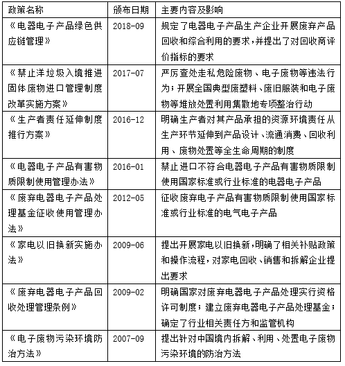為了規(guī)范電子廢棄物的回收處理、提高回收效率、改善自然與社會(huì)環(huán)境,中國政府出臺(tái)了一系列政策,助力行業(yè)可持續(xù)發(fā)展。