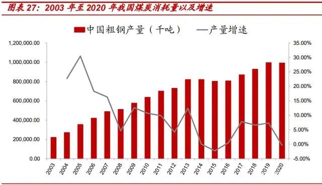 我國(guó)鋼鐵鐵行業(yè)碳排放量占全國(guó)碳排放總量的 15%,是碳排放最高的制造業(yè)。粗鋼作為傳統(tǒng)鋼煉產(chǎn)能主體,在我國(guó)產(chǎn)量居高不下,我國(guó)粗鋼產(chǎn) 量從 1949 年的 15.6 萬(wàn)噸,僅占全球產(chǎn)量的 0.1%,而 2020 年我國(guó)粗鋼 產(chǎn)量為 10.53 億噸,占比全球 53.3%。從增幅方面來(lái)開(kāi)17 年來(lái)我國(guó)粗 鋼產(chǎn)量增速已經(jīng)開(kāi)始走低,為后期粗鋼等低質(zhì)高碳排鋼材的退出作出鋪 墊,但短期粗鋼等仍是我國(guó)鋼鐵行業(yè)產(chǎn)能主流。