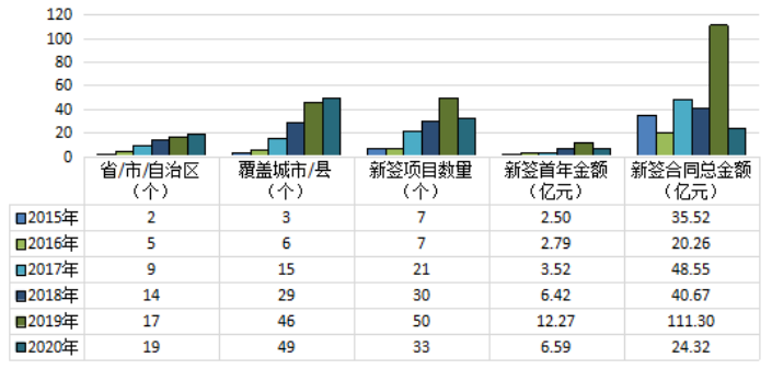 2020年,龍馬環(huán)衛(wèi)新增中標環(huán)衛(wèi)服務項目 33 個,新簽合同年化金額 6.59 億元,同比下降 46.29%,新簽合同總金額 24.32 億元,同比下降 78.15%。