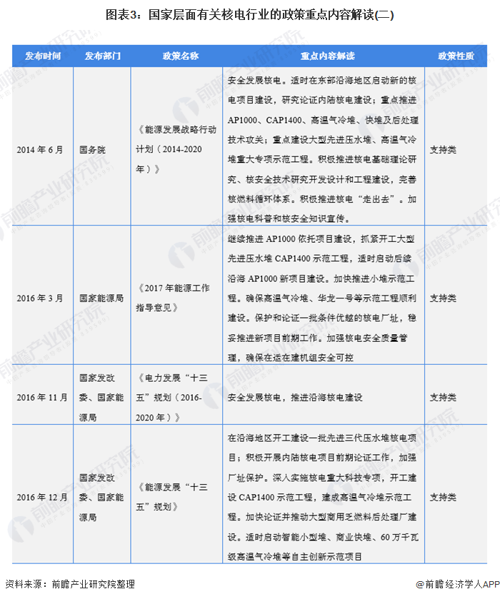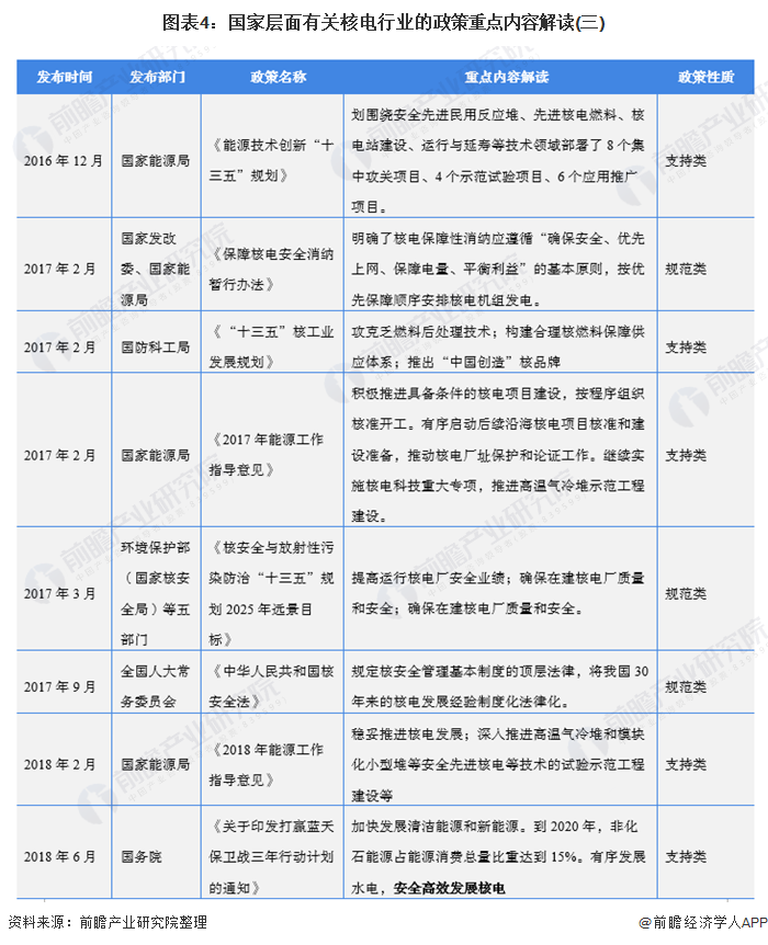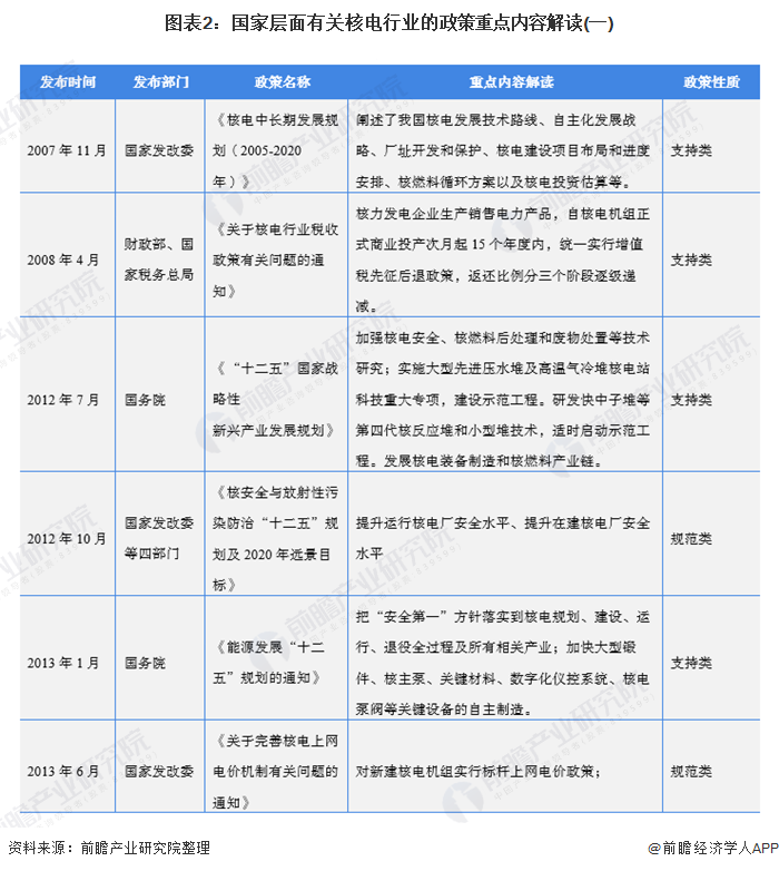 自2007年以來,國務院、國家發(fā)改委、國家能源局等多部門都陸續(xù)印發(fā)了支持、規(guī)范核電行業(yè)的發(fā)展政策,內容涉及核電發(fā)展技術路線、核電廠建設規(guī)范、核電廠安全運行規(guī)范、上網電價政策等內容: