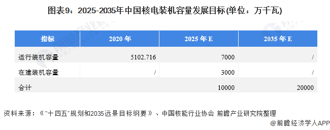 此外,根據中國核能行業(yè)協(xié)會發(fā)布的《中國核能年度發(fā)展與展望(2020)》中的預測數據顯示,到2025年,我國在運核電裝機達到7000萬千瓦,在建3000萬千瓦;到2035年,在運和在建核電裝機容量合計將達到2億千瓦;核電建設有望按照每年6至8臺機組穩(wěn)步推進。
