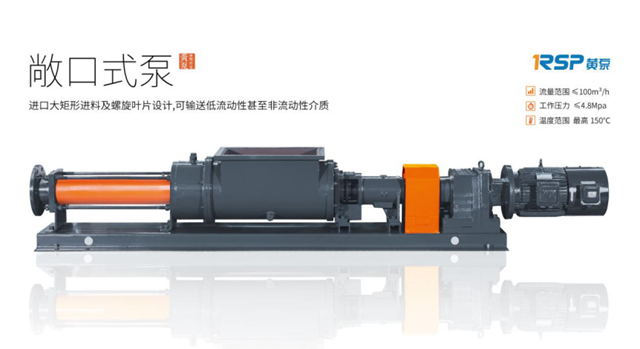 第二款黃泵敞口式單螺桿泵進(jìn)口腔體為矩形進(jìn)料斗設(shè)計,內(nèi)裝有進(jìn)料螺旋葉片,可輸送高粘度、流動性差或非流動性介質(zhì),如脫水污泥等,工作壓力2.4Mpa,流量50m³/h。產(chǎn)品特點(diǎn)為以下幾點(diǎn)。