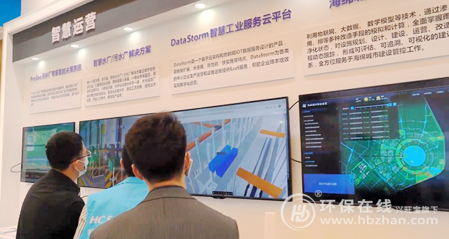 墻面遍布電子屏,ProSee污水廠專家智能決策系統(tǒng)、智慧水廠/污水廠解決方案、DataStorm智慧工業(yè)服務(wù)云平臺(tái)、海綿城市智慧管控平臺(tái)展示,有沒有越看越覺得很有科技范兒?