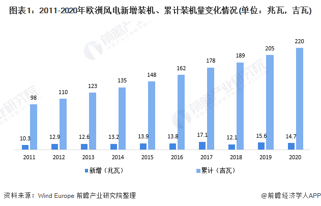 早在20世紀90年代初,歐盟就提出了大力發(fā)展風電的計劃和目標,發(fā)展至今,風電已成歐洲最廉價發(fā)電模式。數(shù)據(jù)顯示,2011-2020年,歐洲風電累計裝機量由98吉瓦增長至220吉瓦,同時每年新增裝機量也不斷提升。2020年,歐洲累計風電裝機量達220吉瓦。