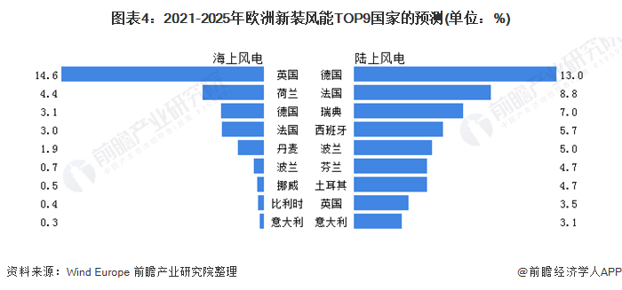 從歐洲各國的風電發(fā)展前景來看,2021-2025年,英國是海上風電發(fā)展的重點,英國將保持14.6吉瓦的年均裝機量;而在陸上風電發(fā)展方面,德國是發(fā)展重點,德國將保持13吉瓦的年均裝機量。