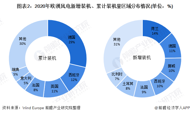 2、2020年德國風電裝機規(guī)模最大、荷蘭新增裝機量最多